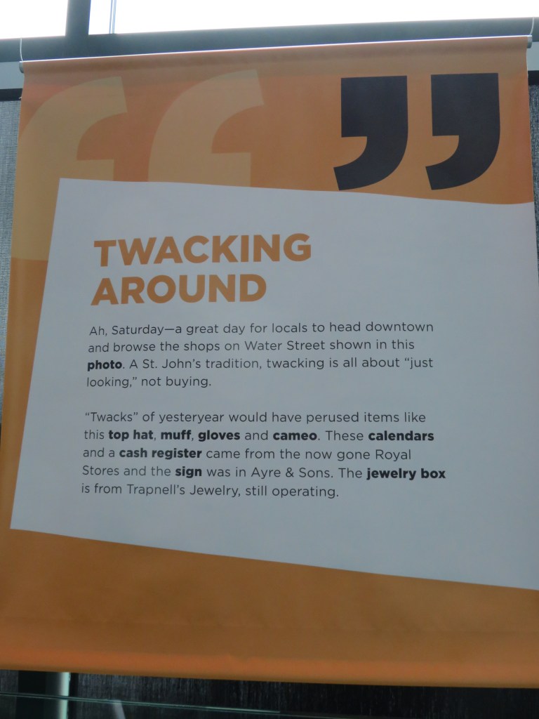 The Rooms also has information on some of the great expressions in Newfoundland (at times it seems that we are in a foreign country). For example, people in Newfoundland do not ask you if you are visiting Newfoundland. They instead ask you if you have “come from away” (incidentally that is the name of a musical that was created based on the hospitality that the people of Newfoundland extended to the numerous US passenger jets that were forced to land in Gander, Newfoundland on 9/11 when all US airports were closed) Window shopping is called “twacking around” – something I have been accused of doing on numerous occasions.