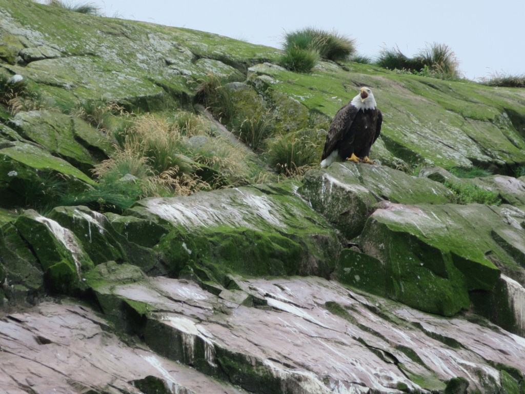 Common murres mate for life, however each winter they fly to different parts of the world and then the next spring (hopefully) reunite and have babies at the same nesting site. These birds don’t abandon their young when they are chicks, and their only defense is “safety in numbers’. You will always see a large group of them together squawking to try to keep predators away. Eagles are one of their predators, but seagulls are predators of their chicks. When an eagle is near the common murre, the adults will abandon their young and then the seagulls will swoop in and eat their chicks. It is a bit depressing particularly when you see it in action as we did.