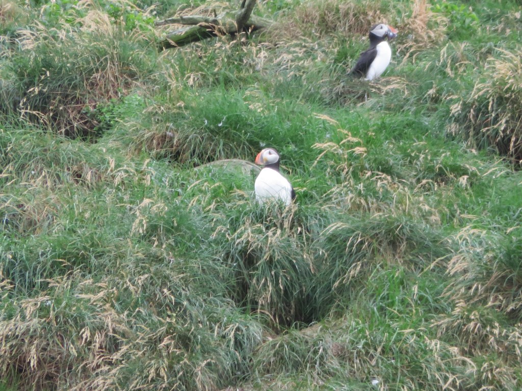 We learned a lot about puffins and common murres. Puffins have the aerodynamics of a Chevy pick-up. The only way they can fly is to take off from the side of a steep hill. Hence, they always build their burrows on a hill. They also abandon their chicks after they are born. The poor chicks need to make their way to edge of the burrow and fling themselves in to the water (they cannot fly until they are 2-3 years old). Only about 5% of puffins make it to adulthood – not surprising, eh?